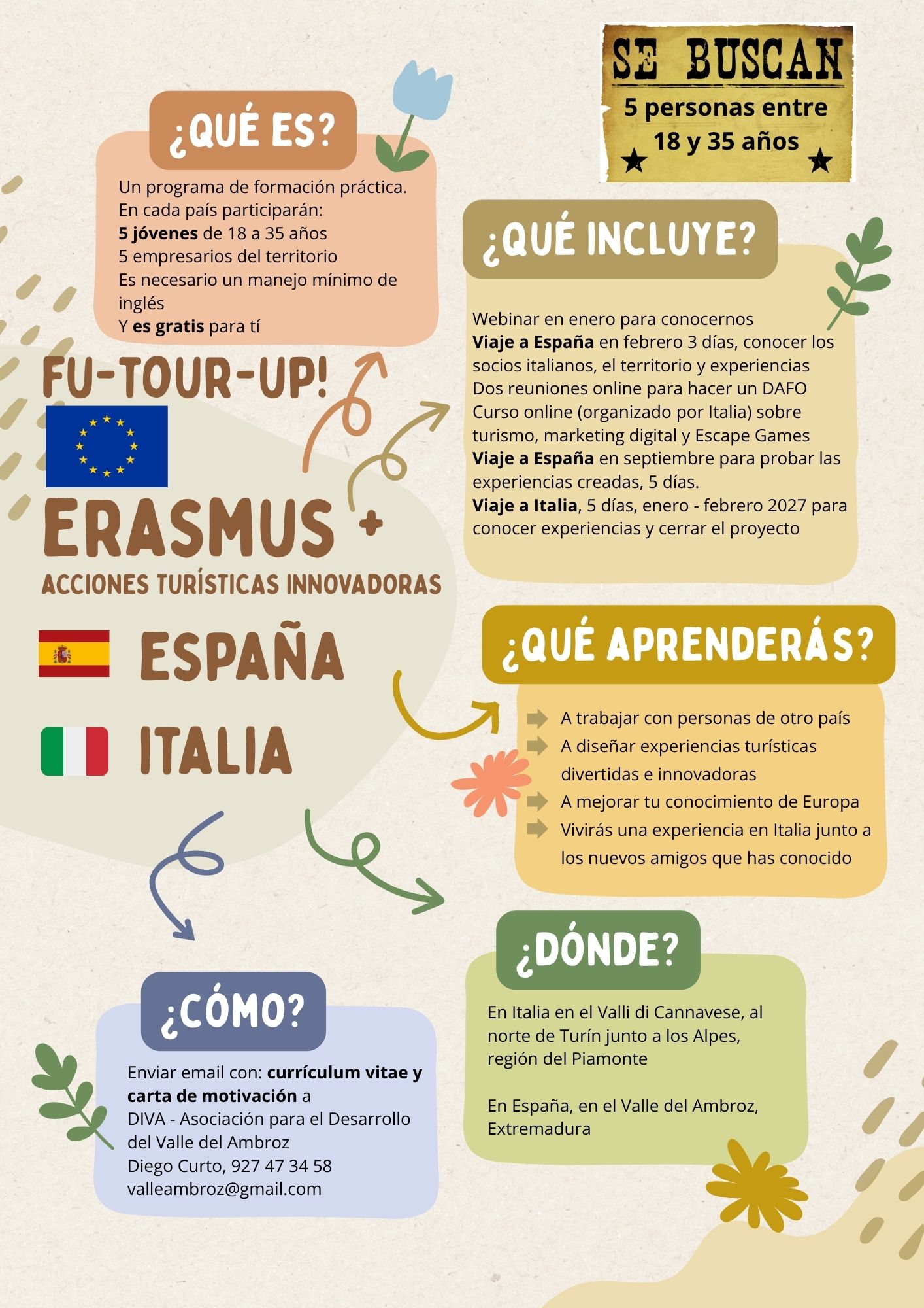 Arranca el proyecto FU-TOUR-UP! en el que cooperan el GAL Valli del Canavese y DIVA. Cinco jóvenes del Ambroz, apoyados por cinco empresarios, aprenderán con el apoyo de especialistas sobre experiencias turísticas innovadoras. Recibirán a sus compañeros italianos y finalmente también visitarán Italia.